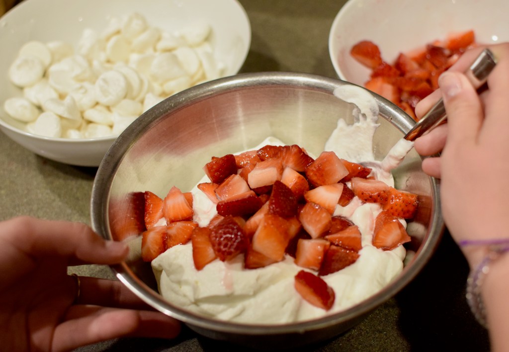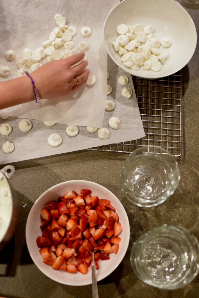Sarah made the parts of the dessert with her children and served it up into bowls for our enjoyment- mini meringues, loose whipped cream and strawberries. When we got home we started scheming our attempt to make it! Lucy and I tried making it just like Sarah did, and our mini meringues were good, though we must have done something wrong because some of them were sticky inside. Next, we bought prepared meringues at Trader Joe’s that are much crunchier and of course makes this a very easy dessert.