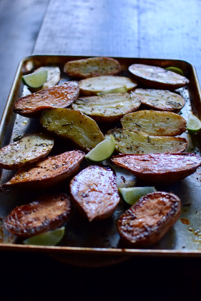Bake until the potatoes are soft to the touch and the cut sides are golden brown, 30-35 minutes. Remove from the oven and flip over. Serve warm with sea salt and lime wedges to squeeze over the potatoes (it’s really yummy)!