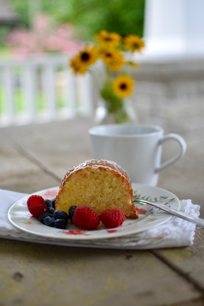 Returning to the cake… it is filled with all the things I love in a cake: buttermilk, butter, sugar and loads of fresh fruit juice and zest! You make a sugared lemon syrup to pour over when it’s hot and flipped out of the pan, and then drizzled with a thicker, more opaque glaze as well.