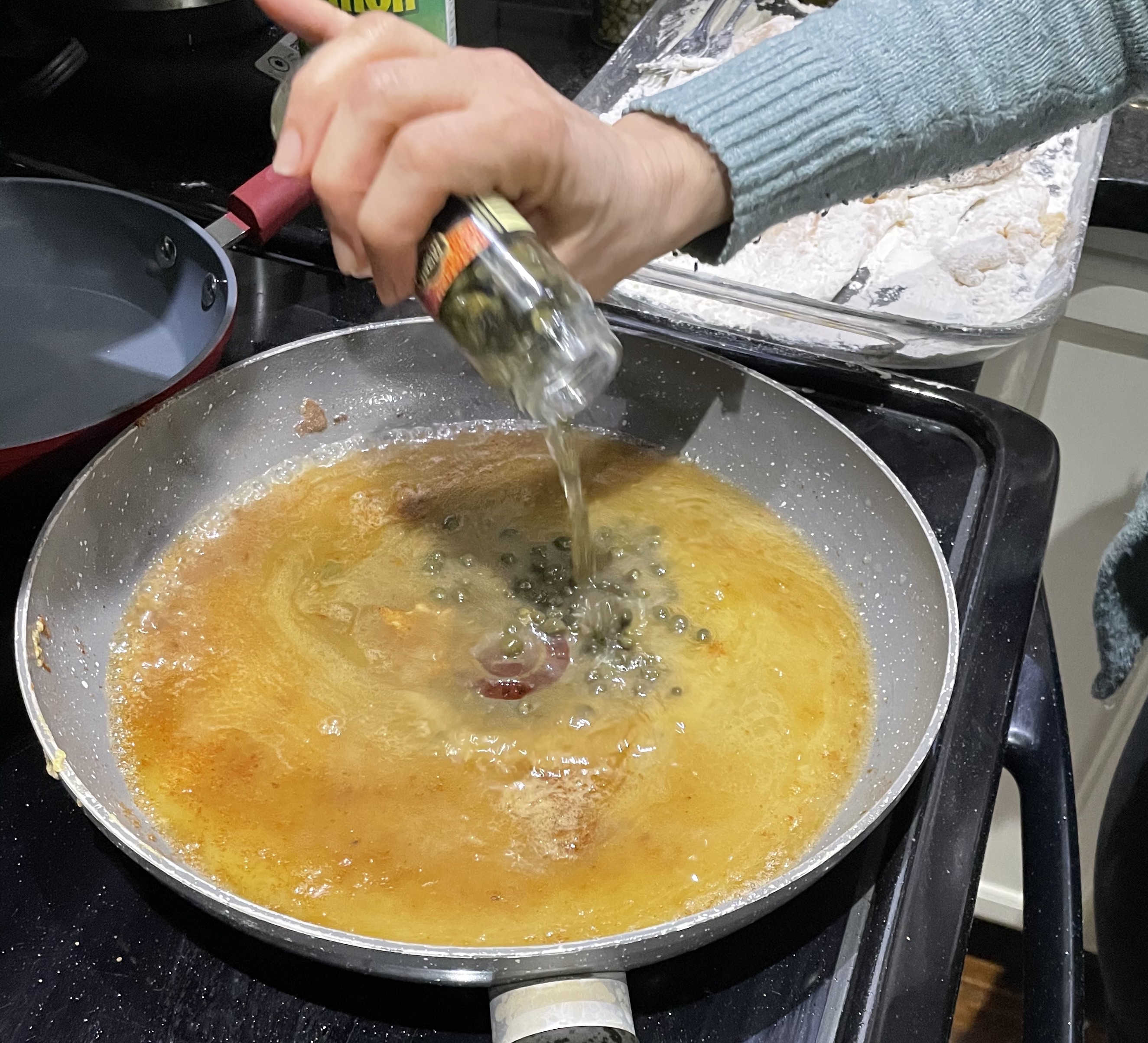 Add garlic and another Tbsp. of butter to the skillet and cook, stirring often and reducing the heat if needed, about 2 minutes. Add wine, capers (with a little of the caper brine), and 2 Tbsp. lemon juice and cook, scraping up any browned bits stuck to the bottom of skillet, until liquid is reduced and thickened a bit, about 3 minutes. Add a little water if needed to thin the liquid. Move sauce to a dish.