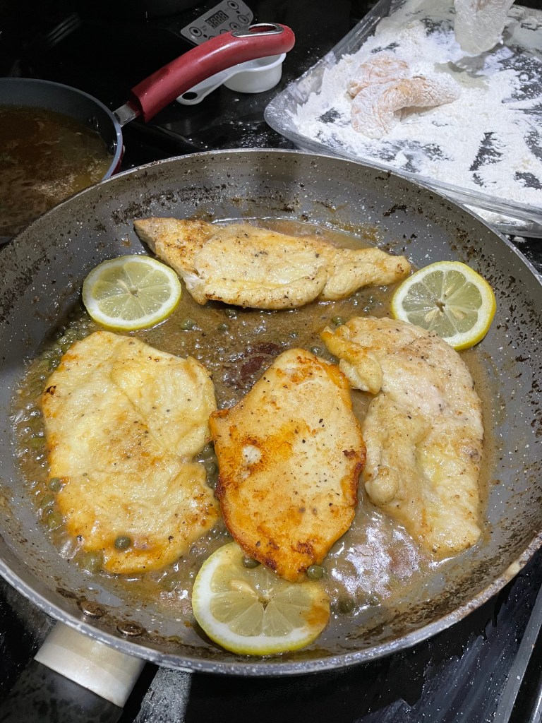 The menu was Chicken Piccata with Massaged Lemony Kale Salad (which I wrote about here and has since become a staple in our kitchen) and Tres Leches Cake with strawberries for dessert (which is still on my “to make” list). It was amazing start to finish! It was such a gift during a pandemic birthday to cook and share a special meal with dear friends. Because it is Melissa’s family’s favorite meal, she didn’t seem stressed, and didn’t use a recipe or measure much. I stood in awe as she chatted and explained and dredged cutlets, and pan fried them, and made sauce (In addition to other parts of the meal). Because there were nine of us with our families, she had to make a lot batches!