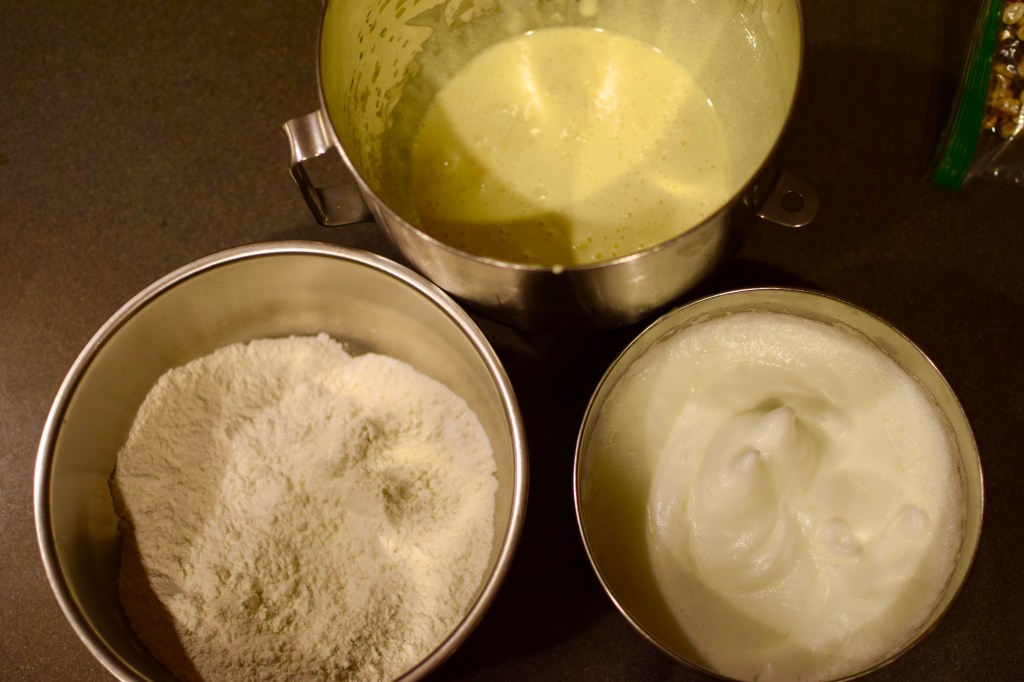 Bowl #1: Beat together egg yolks and 1 cup sugar until stiff ribbons trail behind beaters. Then beat in vanilla. Set aside.