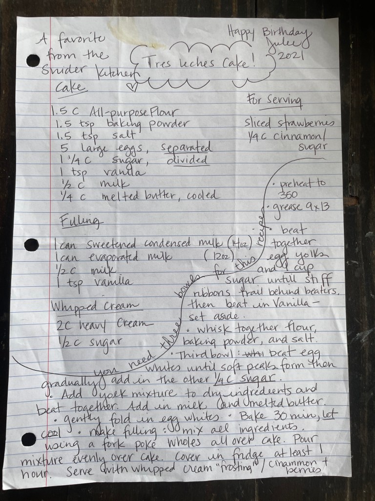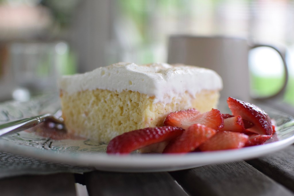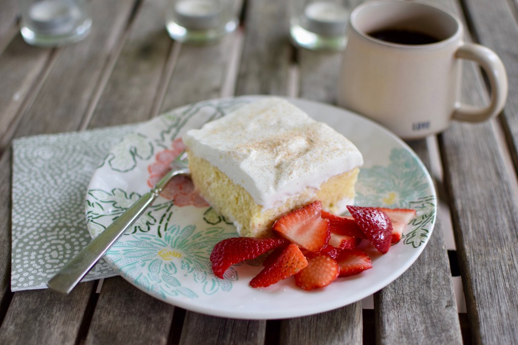 I first posted the Kale Salad, as it immediately became a family staple. Then, months later, I finally had the gumption to try making the main dish, Chicken Piccata, on my own a couple of times. After the second time, and felt confident sharing it and writing up the recipe that was given to me verbally. Now, over two years after the dinner, I am finally sharing the amazing dessert- Tres Leches Cake. It is the best version I have ever eaten. It is so moist and flavorful and a real treat. It’s a moist vanilla cake with a vanilla milky filling poured into the baked sheet cake, cooled and topped with whipped cream, cinnamon and strawberries. It’s a great cake for any season!