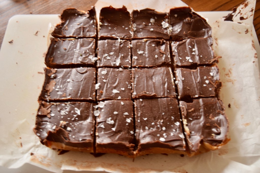 Pour the chocolate over the caramel and level out with a knife or spatula. Spring sparingly with Maldon or other finishing salt.