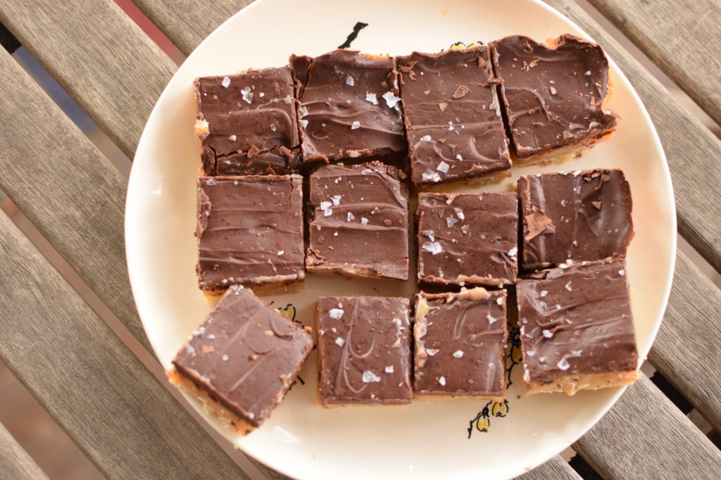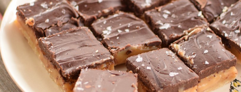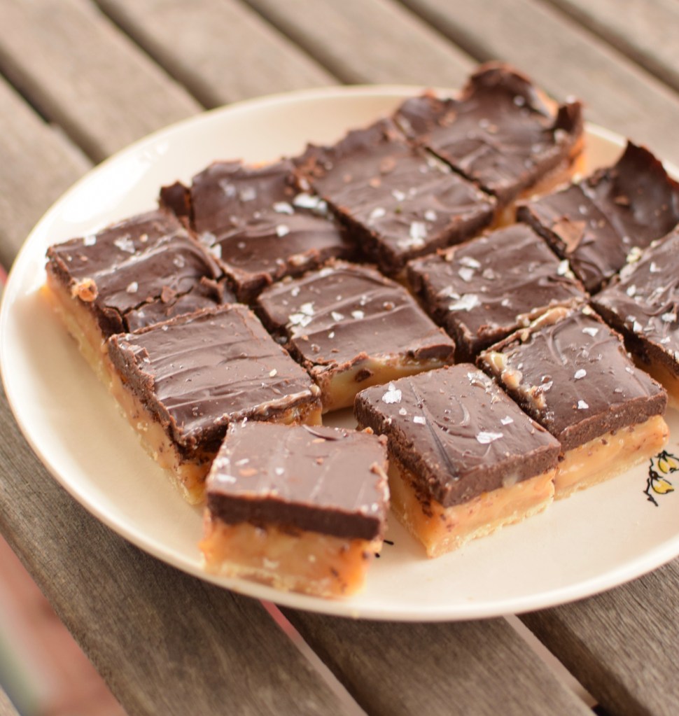 These rich, layered dessert bars have a crust of buttery flaky shortbread, a soft and salty caramel center, and chocolate ganache layer. I sprinkle a little finishing salt on top for an extra touch.