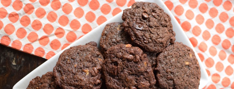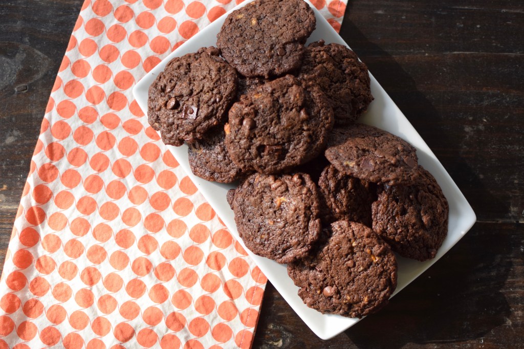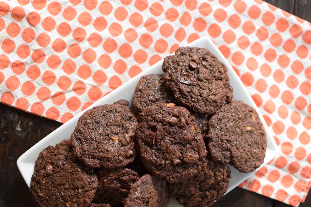 While these cookies are not remarkable looking, they are remarkably yummy. They are crowd pleasing, and yet a little different than a traditional chocolate chip cookie. (Though I have a deep fondness for chocolate chip cookies.) These are more like a brownie-meets-cookie combination.